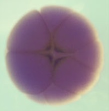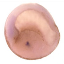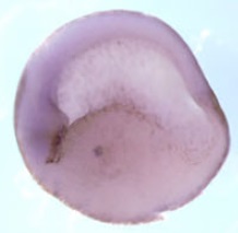 e2f1 (E2F transcription factor 1) gene expression in Xenopus laevis embryo, assayed via in situ hybridization, NF stage 28, vegetal view. |