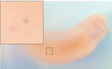rnf38 ( ring finger protein 38 ) gene expression in Xenopus laevis embryo, assayed via in situ hybridization, NF stage 16, lateral view, anterior right, dorsal up. |