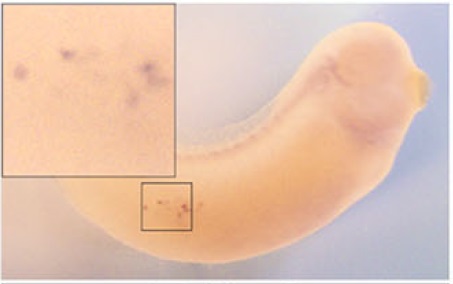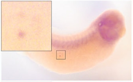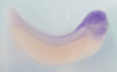 rnf38 ( ring finger protein 38 ) gene expression in Xenopus laevis embryo, assayed via in situ hybridization, NF stage 32, lateral view, anterior right, dorsal up. |