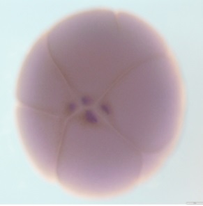 trank1 (tetratricopeptide repeat and ankyrin repeat containing 1) gene expression in Xenopus laevis embryo, assayed via in situ hybridization, oocyte stage i, vegetal view. |