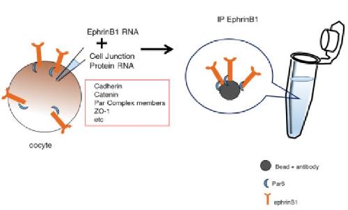 A limited screen for candidate interacting proteins. This schematic depicts the use of isolated stage 6 Xenopus oocytes to test whether a protein of interest (ephrinB1) is able to interact with possible candidate proteins (cellâcell adhesion and cell boundary proteins). Oocytes are injected with in vitro transcribed mRNA encoding ephrinB1 and individual candidate gene mRNAs, cultured for several hours, lysates prepared and ephrinB1 immune-complexes collected. Western analysis should then be performed to detect whether a candidate associates with the ephrinB1 protein