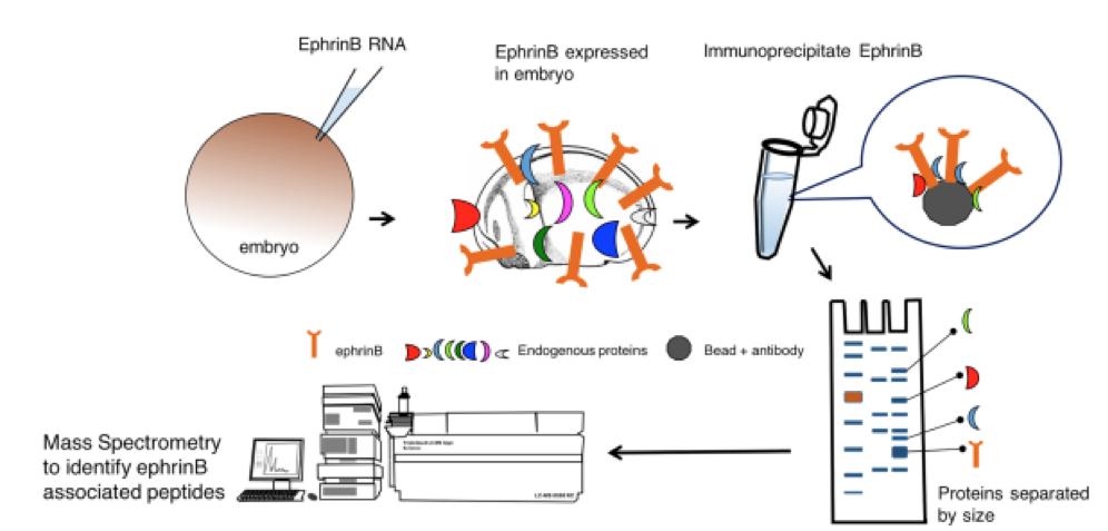 Schematic depicting the use of immunoprecipitation and mass spectrometry to identify possible ephrinB-associated proteins. Xenopus embryos are injected with ephrinB mRNA, cultured until later stages, lysates prepared, and ephrinB immune-complexes collected. Proteins are separated by gel electrophoresis, gel slices removed and prepared for mass spectrometric analysis to identify proteins in the immune-complex