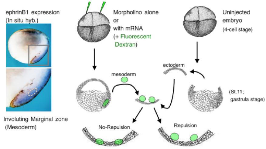 Cell-cell and cell-substrate adhesion are essential to the proper formation and maintenance of tissue patterns during development, and deregulation of these processes can lead to invasion and metastasis of cancer cells. Cell surface adhesion and signaling molecules are key players in both normal development and cancer progression. One set of cell surface proteins, the Eph receptor tyrosine kinases and their membrane-bound ligands, ephrins, are significant regulators of these processes. During embryonic development, the Eph/ephrin signaling system is involved in cell-cell contact events that result in cell sorting and boundary formation between receptor and ligand bearing cells. When migrating cells that display the membrane bound ligands or receptors come in contact with cells bearing the cognate partner, the response may be adhesion or repulsion, ultimately leading to the proper positioning of these cells. During cancer progression, the signaling between these receptor/ligand pairs is often deregulated, leading to increased invasion and metastasis. To gain mechanistic insight into the pathways that mediate Eph receptor and ephrin signaling we have relied upon a very tractable system, the frog Xenopus. This model system has proven to be extremely versatile, and represents a relatively quick and manipulable system to explore signaling events and the in vivo processes affected by these signals.