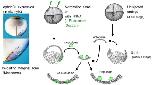 Use of explants to determine the role of proteins in tissue repulsion. The left side of the figure shows a wholemount in situ hybridization of a bisected Xenopus embryo with a probe for ephrinB1 expression; showing expression in the involuting marginal zone. The right side is a schematic depicting the BCR/mesoderm repulsion assay. Four cell stage embryos are injected with either mRNA or MOs or both, along with fluorescent dextran as a tracer. The mesoderm (involuting marginal zone) is removed and placed upon the blastocoel roof (BCR) explant from an uninjected embryo. Light and epifluorescence microscopy allows for visualization of whether the two explants mix or repulse one another