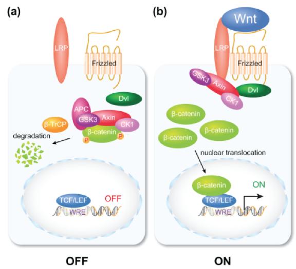 Nuclear β-catenin is the hallmark of canonical Wnt signaling. Diagram depicting two cells and an outline of the canonical Wnt signal transduction pathway. (a) In a cell that is not responding to extracellular Wnt signaling any cytoplasmic β-catenin protein is proteolytically degraded. (b) In response to extracellular Wnt signaling, any cytoplasmic β-catenin protein is stabilized and enters the nucleus to regulate Wnt target gene expression in a complex with DNA-binding transcription factors. For a more detailed recent review of Wnt signaling mechanisms, consult Hoppler and Nakamura (2014)