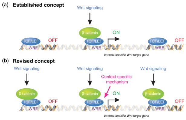 Proposed mechanisms for regulating context-specific Wnt target gene expression. (a) The previously established paradigm asserted that transcription of context-specific Wnt target genes is regulated by restricted access of nuclear β-catenin protein to potential Wnt target gene sequences, with β-catenin association to Wnt target gene sequences therefore considered both required and sufficient for context-specific Wnt target gene regulation. (b) Genome-wide analysis of context-specific Wnt target gene regulation reveals more wide-spread genome association of nuclear β-catenin; including to Wnt target gene sequences that are not transcriptionally regulated in the particular cellular context studied. While β-catenin association to Wnt target gene sequences is required, context-specific mechanisms are additionally required for Wnt target gene transcription