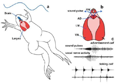 Vocal production in Xenopus. (a) Xenopus call while submerged. (b) Air travels through the glottis to the lungs. The glottis is closed during vocalization. Each sound pulse is generated by separation of paired arytenoids disks (AD), in response to contraction of laryngeal muscles (LM) driven by activity on the vocal nerve (VN). (c) Nerve activity patterns (lower traces) match the sexually differentiated patterns of sound pulses (upper traces) in the male advertisement call and the sexually unreceptive female ticking call