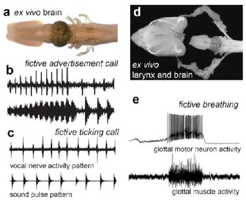 The vertebrate hindbrain includes neural circuits that govern essential functions including breathing, blood pressure and heart rate. Hindbrain circuits also participate in generating rhythmic motor patterns for vocalization. In most tetrapods, sound production is powered by expiration and the circuitry underlying vocalization and respiration must be linked. Perception and arousal are also linked; acoustic features of social communication sounds-for example, a baby's cry-can drive autonomic responses. The close links between autonomic functions that are essential for life and vocal expression have been a major in vivo experimental challenge. Xenopus provides an opportunity to address this challenge using an ex vivo preparation: an isolated brain that generates vocal and breathing patterns. The isolated brain allows identification and manipulation of hindbrain vocal circuits as well as their activation by forebrain circuits that receive sensory input, initiate motor patterns and control arousal. Advances in imaging technologies, coupled to the production of Xenopus lines expressing genetically encoded calcium sensors, provide powerful tools for imaging neuronal patterns in the entire fictively behaving brain, a goal of the BRAIN Initiative. Comparisons of neural circuit activity across species (comparative neuromics) with distinctive vocal patterns can identify conserved features, and thereby reveal essential functional components.
