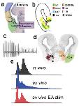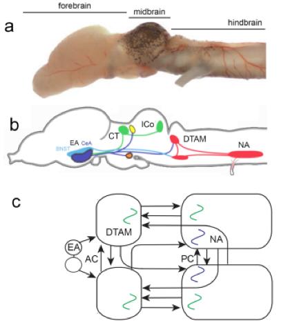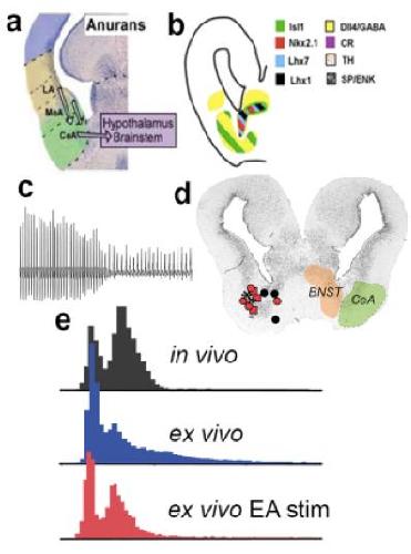 Molecular identity of forebrain nuclei that contribute to vocal initiation. (a) and (b) are modified from âEvolution of the amygdaloid complex in vertebrates, with special reference to the anamnio-amniotic transition,â by Moreno and Gonzalez, 2007, Journal of Anatomy, 211, p 151. (c-e) are modified from âThe Xenopus amygdala mediates socially appropriate vocal communication signals.â by Hall et al., 2013, The Journal of Neuroscience, 33, p 14534. (a) The anuran amygdaloid complex in a transverse hemisection of the caudal forebrain illustrating component nuclei, including descending projections to the brainstem (hindbrain); medial is to the right and dorsal is up. (b) A schematic hemisection corresponding to a and illustrating expression of a number of transcription factors (Isl1, Nkx2.1, Lhx7, Lhx1,Dll4), neurotransmitters or neuromodulators (GABA, TH,SP and ENK) and a calcium-binding protein (CR). Note the widespread distribution of the inhibitory neurotransmitter GABA within the CeA. Expression of these molecular markers corresponds to similar patterns in mammals (not included). (c) A fictive advertisement call recorded from the VN after microstimulation in the EA. (d) Effective (red, asterisks) and ineffective (black) stimulation sites for evoking fictive advertisement calls. (e) Comparison of temporal features (fast and slow trill) recorded from an advertisement calling male (in vivo), a fictively advertisement calling male brain (ex vivo), and following EA microstimulation (ex vivo EA stim) indicates that EA activity can initiate a specific fictive call pattern