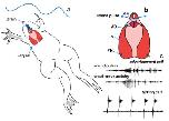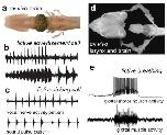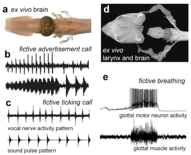 Fictive calling and breathing preparations in X. laevis. (a) The isolated (ex vivo) brain viewed from above (dorsally) from olfactory bulb rostrally (left) to the end of the hindbrain caudally (right). The most caudal rootlet of cranial nerve IX-X (indicated by the line) contains the axons of motor neurons that innervate glottal, laryngeal and heart muscles and comprises the vocal nerve. (b) Fictive advertisement calling (upper trace) can be recorded from the VN when the neuromodulator serotonin is bath applied to the ex vivo brain. The pattern of VN activity follows the pattern of a male advertisement call (lower trace). (c) Fictive ticking (upper trace) can be recorded from the VN when the neuromodulator serotonin is bath applied to the ex vivo brain. The pattern of VN activity follows the pattern of female ticking (lower trace). (from Rhodes et al., 2007). (d) The isolated (ex vivo) brain and innervated larynx viewed from above A branch of cranial nerve IX-X enters the larynx caudally and contains the axons of motor neurons that innervate glottal and laryngeal muscles. e Recordings from glottal muscles (lower panel; also see Figure 1b) reveal spontaneous bursts of activity that correspond to activity of hindbrain glottal motor neurons. This activity pattern produces the opening of the glottis that allows air to travel from the mouth through the larynx to the lungs and is thus termed fictive breathing