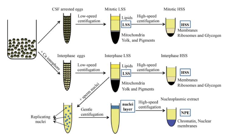 Figure 1. Xenopus egg extract preparation. Collected eggs are activated with Calcium ionophore (middle) or left untreated (top), packed and crushed by low speed centrifugation. This separates the egg contents into a lipid plug floating on the top, an insoluble pellet on the bottom mainly composed by mitochondria, yolk and pigments, and a cytoplasmic layer in between (LSS), which is either mitotic or interphasic. An additional high-speed centrifugation of LSS allows the separation of membranes from the cytosolic fraction (HSS). Interphase LSS can also be used to prepare nucleoplasmic extract (bottom). For this purpose, sperm nuclei replicated in interphase LSS are collected by gentle centrifugation in the presence of microtubule depolymerizing agents, resulting in a nuclear layer floating on the top of the extract. Nucleoplasmic extract is then obtained by high-speed centrifugation of this nuclear layer