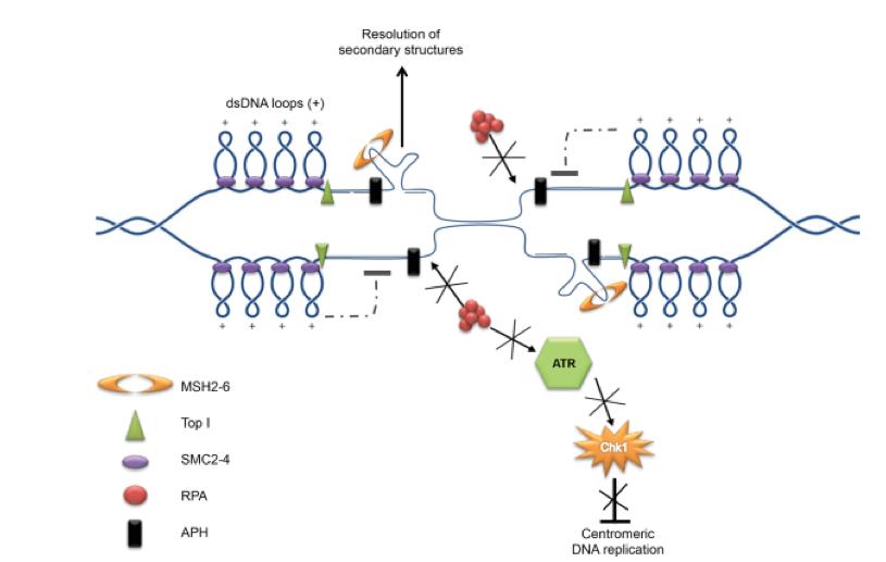 Structural and regulatory features of centromeric DNA. Repetitive centromeric chromatin is organized in loops of dsDNA enriched for condensins (SMC2-4) and Topoisomerase I (Top I). Efficient DNA synthesis depends on MSH2-MSH6 proteins, which might be required to resolve the secondary structures arising on centromeric repeats. This topological arrangement limits the formation of extensive ssDNA regions and RPA hyper-loading onto chromatin, triggered by the uncoupling of helicase and polymerase induced by fork stalling agents. Inhibition of RPA binding to chromatin prevents ATR activation, resulting in Chk1 activity suppression and more efficient centromeric DNA replication