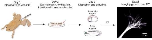 The model system, Xenopus laevis, has been used in innumerable research studies and has contributed to the understanding of multiple cytoskeletal components, including actin, microtubules, and neurofilaments, during axon pathfinding. Xenopus developmental stages have been widely characterized, and the Xenopus genome has been sequenced, allowing gene expression modifications through exogenous molecules. Xenopus cell cultures are ideal for long periods of live imaging because they are easily obtained and maintained, and they do not require special culture conditions. In addition, Xenopus have relatively large growth cones, compared to other vertebrates, thus providing a suitable system for imaging cytoskeletal components. Therefore, X. laevis is an ideal model organism in which to study cytoskeletal dynamics during axon pathfinding.