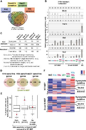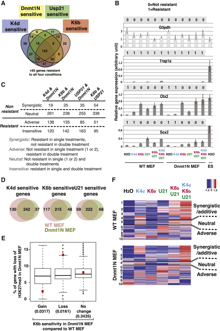 Figure 4. Multiple Chromatin Modifier Combinations Affect Resistance at a Single-Gene Level(A) Venn diagram shows the number of genes losing resistance upon four individual chromatin modifier treatments.(B) Example of digital signature of resistance obtained by differential gene expression analysis for a non-resistant (G3pdh) and three resistant (Trap1A, Otx2, and Sox2) genes. The digital signature indicates whether a gene is resistant (shown as 1 when the gene is differentially expressed in MEF-NT compared to ES-NT) or loses resistance (shown as 0, when the gene is not differentially expressed in MEF-NT compared to ES-NT) in each of the 12 conditions tested. The bar graphs show qRT-PCR analysis of gene expression (mean ± SEM of four samples of eight oocytes NT).(C) The numbers of genes for which a synergistic, neutral, adverse, or insensitive effect is observed when combining two chromatin modifier treatments are shown.(D) Venn diagram shows the number of genes sensitive to a histone modifier (Kdm4d, Kdm6b, or USP21) in nuclei with normal (WT) or hypomethylated DNA (Dnmt1N).(E) Loss of resistant gene sensitivity to Kdm6b in DNA-hypomethylated MEF correlates with loss of H3K27me3. The y axis indicates the number of genes that lose H3K27me3 in MEF with hypomethylated DNA compared to WT MEF. Resistant genes are split according to change in sensitivity to Kdm6b after NT when comparing WT MEF to MEF with hypomethylated DNA (red dot). The boxplot shows the background distribution of H3K27me3 change when sampling 10,000 times for a random set of genes of the same size as the resistant gene subset tested. The number in parentheses indicates a p value generated by calculating the proportion of the random background that has a more extreme value than the observed percentages from each of the three groups.(F) Heatmap illustrating the change in gene expression in normal (WT MEF nuclei) or hypomethylated DNA (Dnmt1N MEF nuclei) upon expression of histone modifiers. Ten clusters representing the main trend of gene expression change were selected based on k-means clustering of expression data from RNA-seq analysis (RPKM). The trend of change in gene expression in these ten clusters is shown in the heatmap as a Z score. See also Table S4. |