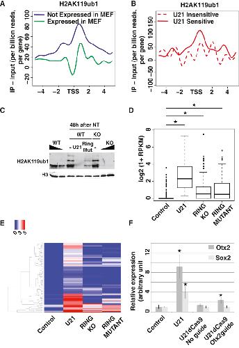 Figure 5. USP21 Removes Resistance through Deubiquitylation of H2A(A) Metaplot analysis in MEF of H2AUb ChIP-seq ±5 kb around the TSSs of genes expressed (green) or not expressed (blue) in MEF is shown.(B) Same as (A) but resistant genes are split according to sensitivity (red line) or insensitivity (red dashed line) to USP21.(C) WB analysis of H2AK119ub1 level in WT or Ring1a&b KO-transplanted nuclei 0 and 48 hr after nuclear transfer. Nuclei were transplanted in control oocyte or in oocyte overexpressing USP21 or catalytically inactive XlRing1b (Ring Mut).(D) Boxplot shows expression of the set of genes upregulated in WT MEF transplanted to USP21 compared to WT MEF transplanted to control oocytes (★p value < 10−11, Welch two-sample t test).(E) Heatmap showing unsupervised hierarchical clustering of genes upregulated in WT MEF transplanted to USP21-expressing oocyte compared to control oocytes in WT MEF transplanted to control oocytes, to USP21-expressing oocytes, to XlRing1b mutant-expressing oocytes, and in Ring1a&Ring1b KO MEF transplanted to control oocytes. Expression value is shown as log2(1 + RPKM).(F) dCas9-USP21 targeted to the Otx2 promoter decreases Otx2 resistance to transcriptional reprogramming. The qRT-PCR analysis of Otx2 and Sox2 gene expression 48 hr after MEF transplantation to oocytes injected with water (control), USP21 RNA, or USP21-dCas9 RNA, with or without Otx2 gRNAs mix, is shown (★p value < 0.05, Student’s t test; mean ± SEM of four experiments). See also Figure S4 and Table S5. |