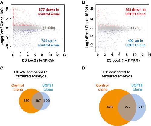 Figure 6. USP21 Improves Transcriptional Reprogramming of Two-Cell-Stage Cloned Mouse Embryos(A) MA plot showing log fold change in gene expression between fertilized embryos and ES clone embryos (logFC, y axis) against the log of gene expression in cultured ES (logCPM, x axis). Differentially expressed genes are shown in red and blue for genes downregulated and upregulated in clones compared to fertilized embryos, respectively (FDR < 0.05, three experiments).(B) Same as (A) except that USP21 was overexpressed in the cloned embryos.(C and D) Venn diagram indicating the overlap between the downregulated genes (C) and upregulated genes (D) in control and USP21 clones. See also Figure S5 and Tables S6 and S7. |