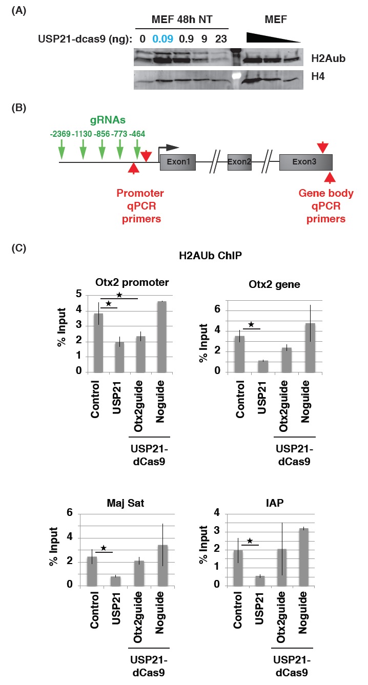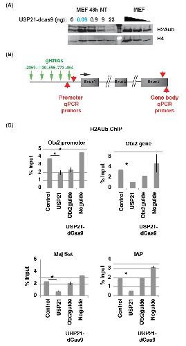 Supplemental Figure S4 related to Figure 5. USP21-dCas9 mediated H2A deubiquitylation of Otx2. (A) Titration of USP21-das9 mRNA injection. Oocytes were injected with 0 to 23 ng of USP21-dcas9 mRNA 24h prior to nucler transplantation. 48h after nuclear transfer the transplanted chromatin is recovered and analysed by western blot for H2AK119u1 level. Injection of 0.09 ng of USP21-dcas9 does not globally affect H2AK119u1 level in transplanted chromatin and this amount of mRNA was therefore used for subsequent targeting experiments. (B) Location of guide RNAs targeting the Otx2 promoter (green arrows) as well as the primers used in ChIP-qPCR experiment (red arrows). (C) H2AK119u1 ChIP for Otx2 promoter, Otx2 gene body, and repeat elements of the genome (major satellite and IAP) following nuclear transfer to control oocytes, USP21 (9ng) injected oocytes, or USP21dcas9 injected (0.09ng) oocytes together with or without co-injection of Otx2 guide RNAs mix. ('star', P value< 0.05, Mann-Whitney test). Mean +/- sem from n=2 experiments |