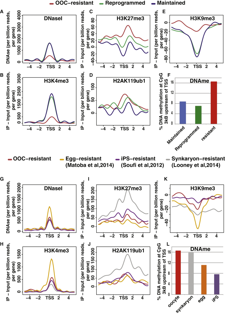 Figure 2. Epigenetic Configuration of MEF Genes Resistant to OOC-Mediated Transcriptional Reprogramming(AâE) Shown is the (A) DNase I sensitivity (Yue et al., 2014), (B) H3K4me3 (Kaneda et al., 2011), (C) H3K27me3 (Kaneda et al., 2011), (D) H2Aub (this study), and (E) H3K9me3 (Bulut-Karslioglu et al., 2014) metaplot analysis ±5 kB around the TSSs, in MEF, of genes with reprogrammed (green), maintained (blue), and resistant (red) expression following nuclear transfer.(F) DNA methylation in the promoter region (3 kb upstream TSS) of reprogrammed, maintained, or resistant genes is shown as the percentage of CpG showing >95% methylation (data from Reddington et al., 2013).(GâK) Shown is the (G) DNase I sensitivity (Yue et al., 2014), (H) H3K4me3 (Kaneda et al., 2011), (I) H3K27me3 (Kaneda et al., 2011), (J) H2Aub (this study), and (K) H3K9me3 (Bulut-Karslioglu et al., 2014) metaplot analysis ±5 kB around the TSSs of genes showing resistance in OOC-NT (red, from this study), mouse egg-NT (orange, from Matoba et al., 2014), transcription factor-induced reprogramming (purple, from Soufi et al., 2012), and cell fusion (gray, from Looney et al., 2014).(L) DNA methylation in the promoter region (3 kb upstream TSS) of genes resistant in OOC-NT, mouse egg-NT, transcription factor-induced reprogramming, and cell fusion is shown as the percentage of CpG showing >95% methylation (data from Reddington et al., 2013). See also Figure S2. |