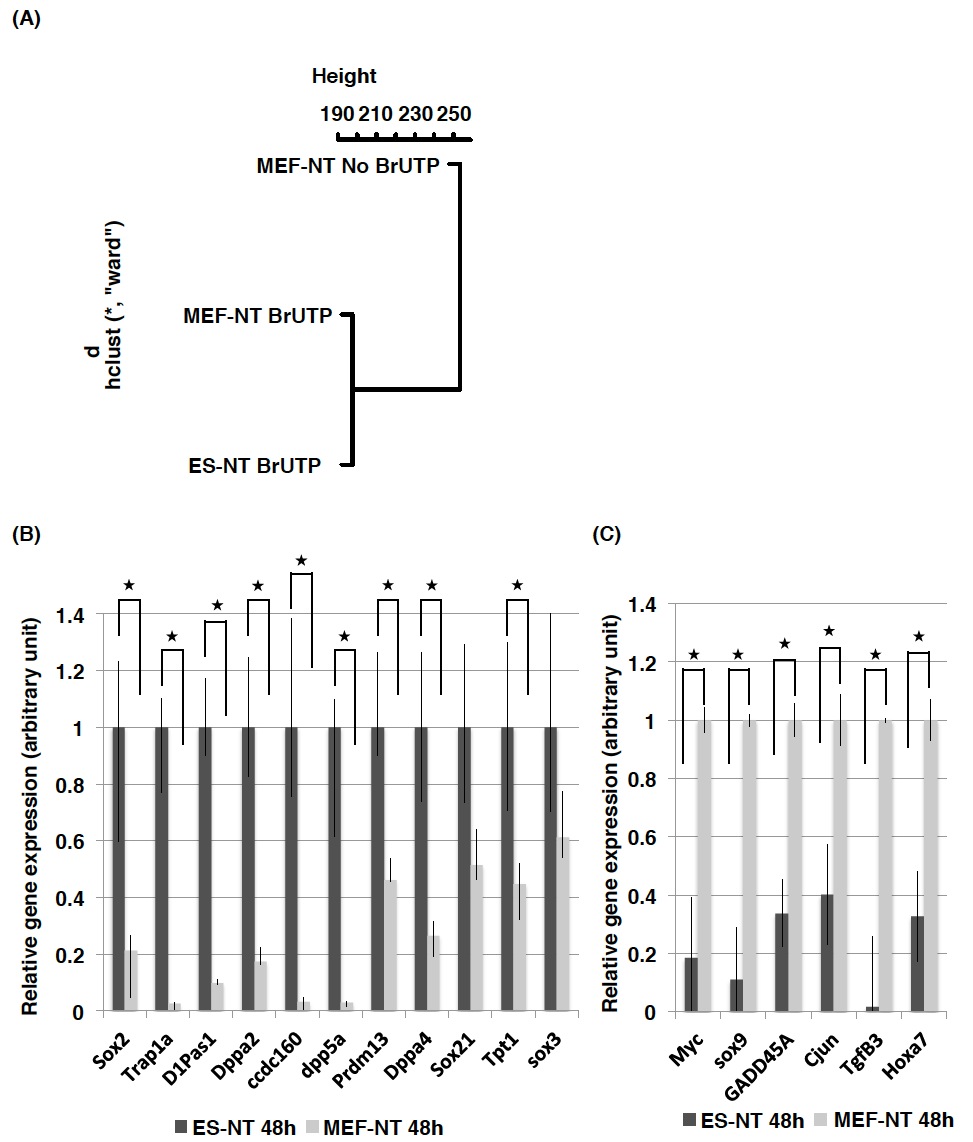 Supplemental Figure S1 related to Figure 1. Identification of resistant genes by RNA-seq analysis of BrUTP labelled RNA 48h after nuclear transfer. (A) hierarchical clustering of RNA-seq data obtained from samples obtained with (MEF-NT and ES-NT BrUTP)or without BrUTP labelling (MEF-NT No BrUTP) . (B)(C) RT-qPCR analysis of genes identified as resistant in MEF (B) or ES (C). Mean +/- sem from n=3 experiments. (★, P value< 0.05, student t-test). |