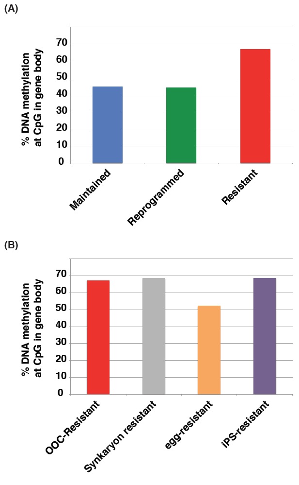 Supplemental Figure S2 related to Figure 2. CpG methylation in the gene body of resistant genes (A) DNA methylation in the gene body of reprogrammed , maintained or resistant genes shown as percentage of CpG showing >95% methylation (data from (Reddington et al., 2013),). (B) DNA methylation in gene body of genes resistant in OOC-NT, mouse egg-NT, transcription factor induced reprogramming, and cell fusion shown as percentage of CpG showing >95% methylation (data from (Reddington et al., 2013),). |