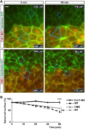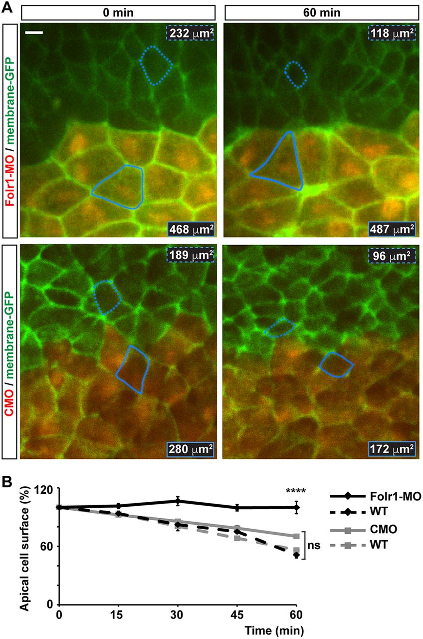 Fig. 5. Medial neural plate cells deficient in folate receptor 1 fail to constrict apically during neural plate folding. Two-cell-stage embryos were unilaterally microinjected with 10 pmol morpholino against Folr1 (Folr1-MO) or control morpholino (CMO) along with Alexa Fluor 594-dextran conjugate and bilaterally injected with membrane-GFP. Apical surface of superficial neural plate was time-lapse imaged from whole embryos at a rate of 0.2â minâ1. Regions of interest were selected to contour cells close to the midline that remained visible during the 1-h recording and did not divide during this period. (A) Shown are representative examples for the indicated time points of Folr1-MO- and CMO-unilaterally injected and imaged embryos. Outlined is one wild-type (dashed) and one MO-containing (solid) cell for which the apical surface was measured over time. Numbers indicate apical cell surface for the same outlined cells at 0 and 60â min of recording. Scale bar: 10â μm. (B) Graph shows apical cell surface (as percentage of initial cell surface at 0 min, 100%) at the indicated time points. Mean±s.e.m.; n=30 Folr1-MO-, 28 CMO-containing cells, and 30 contralateral wild-type (WT) cells per group; ****P<0.0001; ns, not significant; two-way ANOVA. |