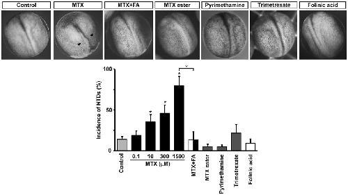 Fig. 7. Pharmacological inhibition of folate uptake systems affects Xenopus laevis neural tube formation. Embryos at stage 13 (14.75 hpf) were incubated with 100 nM-1.5 mM methotrexate (MTX), 1 nM-300 μM methotrexate ester, 1 nM-100 μM pyrimethamine, 100-500 μM trimetrexate or vehicle (control, 0.3% DMSO or saline). Embryos were fixed and photographed under a macroscope when controls reached neural tube closure, at stage 20 (22 hpf). Shown are representative examples. Arrowheads indicate defective neural tube closure. Rescue of 1.5 mM MTX-induced NTD phenotype was performed by preincubating two- to four-cell-stage embryos with 10 mM folinic acid (FA). Graph shows mean±s.e.m. percentage defective embryos; n≥6 independent experiments with n≥10 embryos per group, per experiment; *P<0.01; two-way ANOVA. |