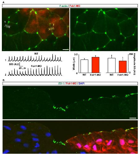 Fig. S4. Folr1 knockdown does not induce changes in actin dynamics or in overall apicobasal polarity in the folding neural plate. (A) Two-cell-stage embryos were unilaterally microinjected with Folr1-MO along with Alexa Fluor 594-dextran conjugate (red) and bilaterally injected with mCherry-UtropinCH (F-actin reporter, green). Superficial medial neural plate was time-lapse imaged from whole embryos at a rate of 1- 2 min−1. Fluorescence intensity profiles (arrows) across cell-cell borders were measured among wild-type (WT, 1) and Folr1-MO (2) containing cells during 15 min imaging. Scale bar, 10 μm. Intensity profiles were fitted with Gauss function using R software after background substraction. Bar graph shows mean±SEM peak width at 50% maximum intensity (left) and standard deviation (SD) of normalized maximum intensity during 15 min recording (right), n: 28 cell-cell borders per group, t-test. (B) Unilateral Folr1-MO-containing neural plate stage embryos were sectioned and processed for immunostaining with anti-ZO-1 (green). Scale bar, 20 μm. |