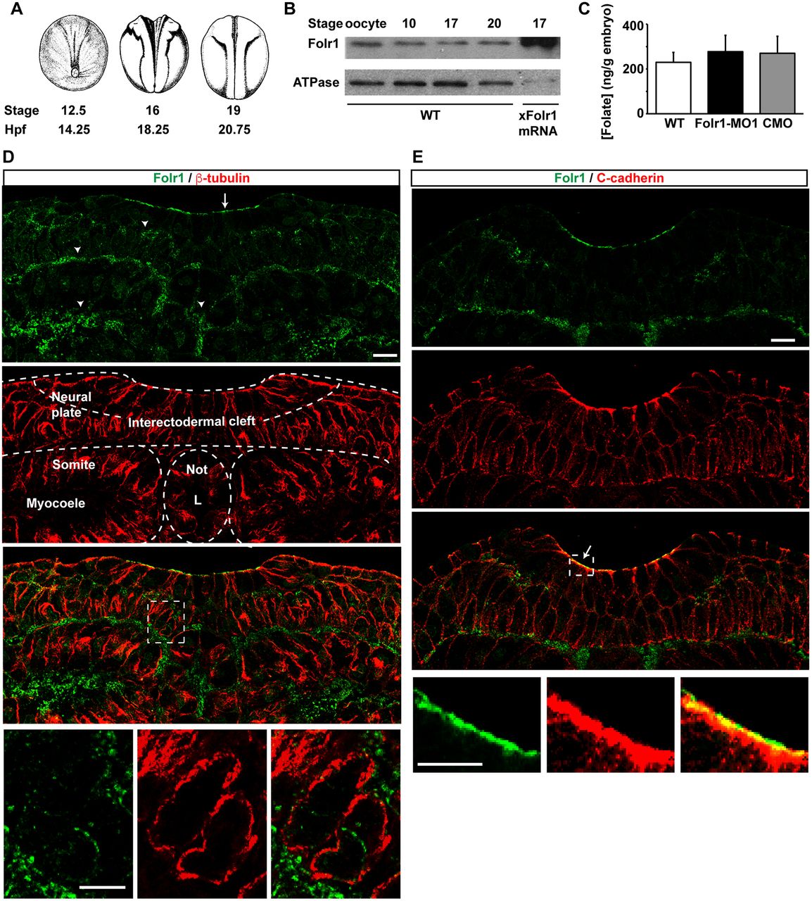 Fig. 1. Folate receptor 1 expression during Xenopus laevis neural tube formation. (A) Time course of Xenopus laevis neurulation. hpf, hours post-fertilization. (B) Western blot assays from homogenates of wild-type (WT) or Xenopus laevis folate receptor 1 (Folr1)-overexpressing embryos at the indicated developmental stages. (C) Folate is present during Xenopus neural tube formation and folate levels do not change upon Folr1 knockdown. Data show folate levels measured by ELISA assay in homogenates from stage 13-17 (14.5-19â hpf) WT, folate receptor 1 morpholino 1 (Folr1-MO1)- or standard control morpholino (CMO)-injected embryos. Mean±s.e.m.; n=8 independent measurements from n>40 embryos/group; average embryo weight: 2±0.4â mg. (D,E) Neural plate stage embryos were processed for Folr1 (green) and β-tubulin (D, red) or C-cadherin (E, red) immunostaining. Shown are representative transverse sections of immunostained samples at neural plate stages 15 (D) and 17 (E). (D) Arrow in top panel indicates Folr1 localization at the apical neural plate surface and arrowheads indicate localization in extracellular spaces. Bottom panels show higher magnifications of the boxed area in the panel above and illustrate Folr1 localization to extracellular spaces. L, notochord lumen; Not, notochord. (E) Arrow indicates that Folr1 localizes to the apical neural plate surface along with adherens junction protein C-cadherin. Bottom panels show higher magnifications of the boxed area in the panel above. Scale bars: 20â μm. |