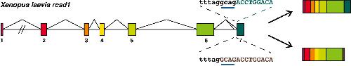 Xenopus laevisRcsd1. The Rcsd1 variant found during early Xenopus embryogenesis is shorter at the C-terminus due to alternative splicing at the boundary between intron 6 and exon 7. Small letters indicate intron sequences, capital letters indicate exon sequences. |