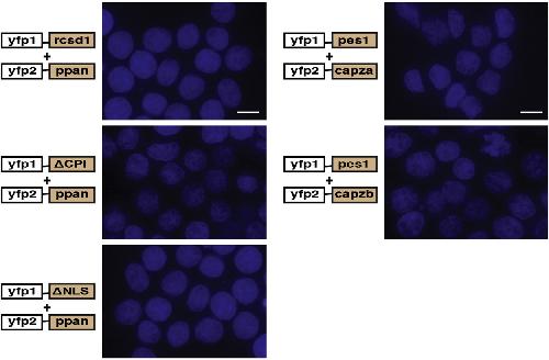Negative controls for the YFP interaction assay. HEK293 cells were transiently transfected with the different murine Rcsd1 and CapZ constructs used in Fig. 6 together with unrelated genes for negative controls. Neither CapZ (CapZa and CapZb) do interact with Xenopus Pes1 nor the full length or different deletion constructs of Rcsd1 with Xenopus Ppan.
