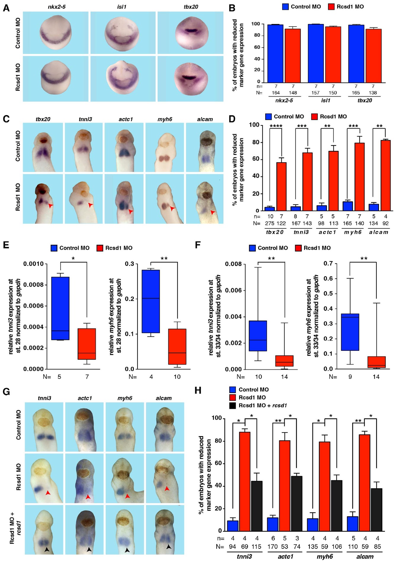 Fig. 4. : Rcsd1 depletion interferes with cardiac differentiation. A. Expression of nkx2-5, isl1 and tbx20 at stage 20 upon Rcsd1 down-regulation. B. Quantitative presentation of data shown in A. C. Unilateral injection Rcsd1 MO leads to reduced cardiac marker gene expression at stage 28 (ventral views, red arrowheads). D. Quantitative presentation of data shown in C. E-F. qPCR approaches with cardiac explants at stage 28 (E) and stage 33/34 (F) confirmed the down-regulation of tnni3 and myh6 upon Rcsd1 depletion. N, number of single explants used for qPCR. G. Unilateral inhibition of cardiac marker gene expression upon Rcsd1 MO injection (ventral views, red arrowheads) is restored by the co-injection of full-length Xenopus rcsd1 RNA (ventral views, black arrowheads). H. Quantitative presentation of data shown in G. n, number of independent experiments; N, number of analysed embryos. Error bars indicate standard error of the means (s.e.m.). *, pâ¤0.05, **; pâ¤0.01; ***, pâ¤0.001; ****, pâ¤0.0001; calculated by a non-parametric Mann-Whitney rank sum test. |