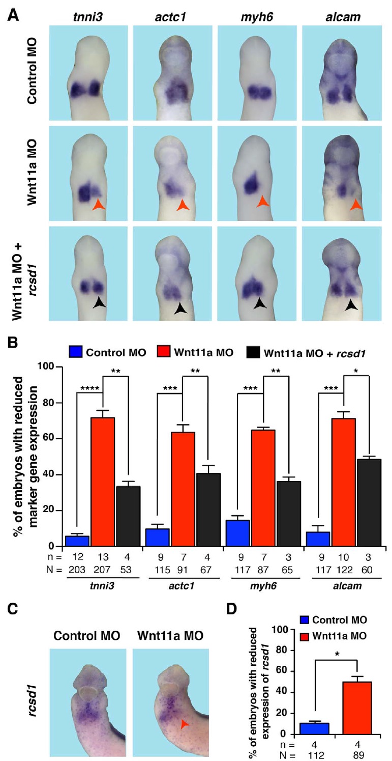 Fig. 5. : Rcsd1 acts downstream of Wnt11a. A. Unilateral injection of Wnt11a MO leads to inhibition of cardiac marker gene expression (red arrowheads), which is restored by the co-injection of Xenopus full-length rcsd1 RNA (black arrowheads). B. Quantitative presentation of data shown in A. C. Unilateral injection of Wnt11a MO leads to inhibition of rcsd1 expression (red arrowheads) D. Quantitative presentation of data shown in C. n, number of independent experiments; N, number of embryos analysed. Error bars indicate standard error of the means (s.e.m.). *, pâ¤0.05, **; pâ¤0.01; ***; pâ¤0.001; ****, pâ¤0.0001; calculated by a non-parametric Mann-Whitney rank sum test. |