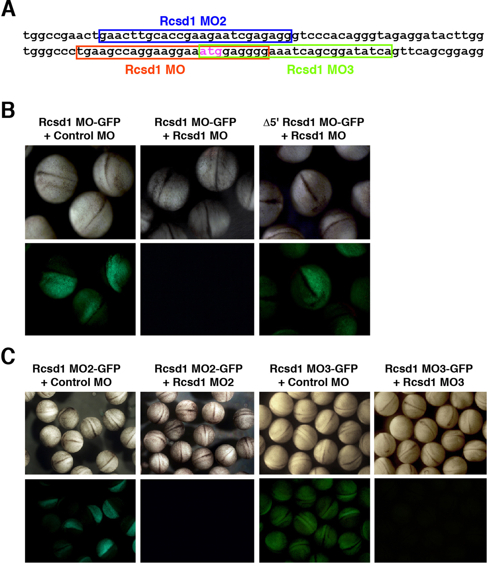 Specificity and efficiency of Rcsd1 antisense morpholino oligonucleotides (MOs). A. 5â untranslated region (UTR) of rcsd1 mRNA. Binding sites of Rcsd1 MOs 1â3 are indicated. The ATG start codon is highlighted in pink. B-C.In vivo Rcsd1 MO binding efficiency test. Rcsd1 MO-GFP-fusion constructs and MOs were co-injected bilaterally at 2-cell stage embryos as indicated. The Rcsd1 MOs specifically blocked the translation of the Rcsd1 MO-GFP fusion constructs (no gfp signal) but not the â5âUTR Rcsd1 MO-GFP fusion constructs (gfp signal). The Control MO does not bind to the Rcsd1 MO binding site.