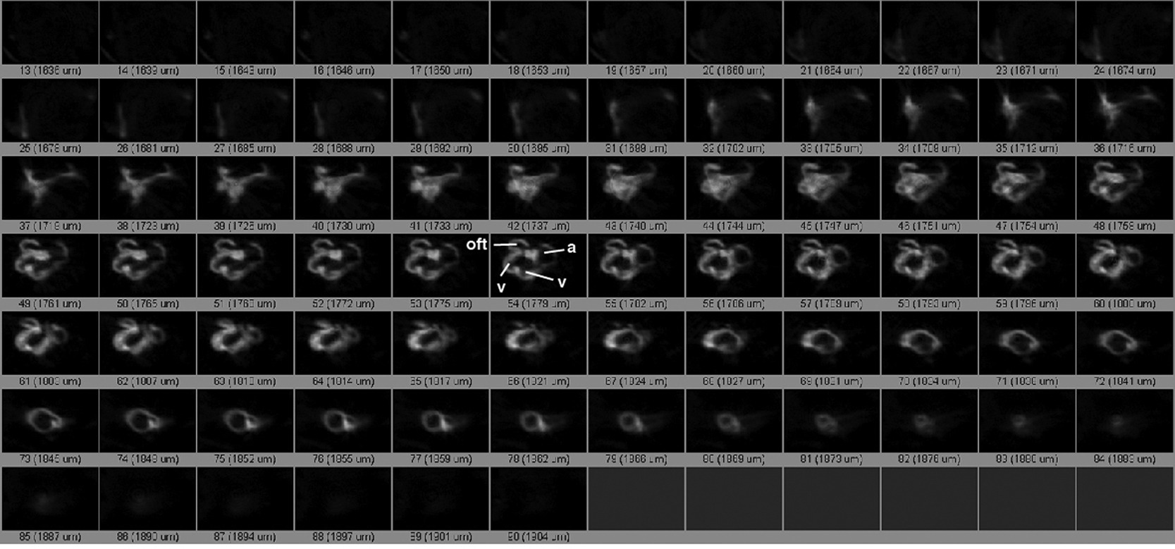 Serial sections through a heart of a Control MO injected embryo derived from OPT image stacks. a, atrium; oft, outflow tract; v, ventricle. |