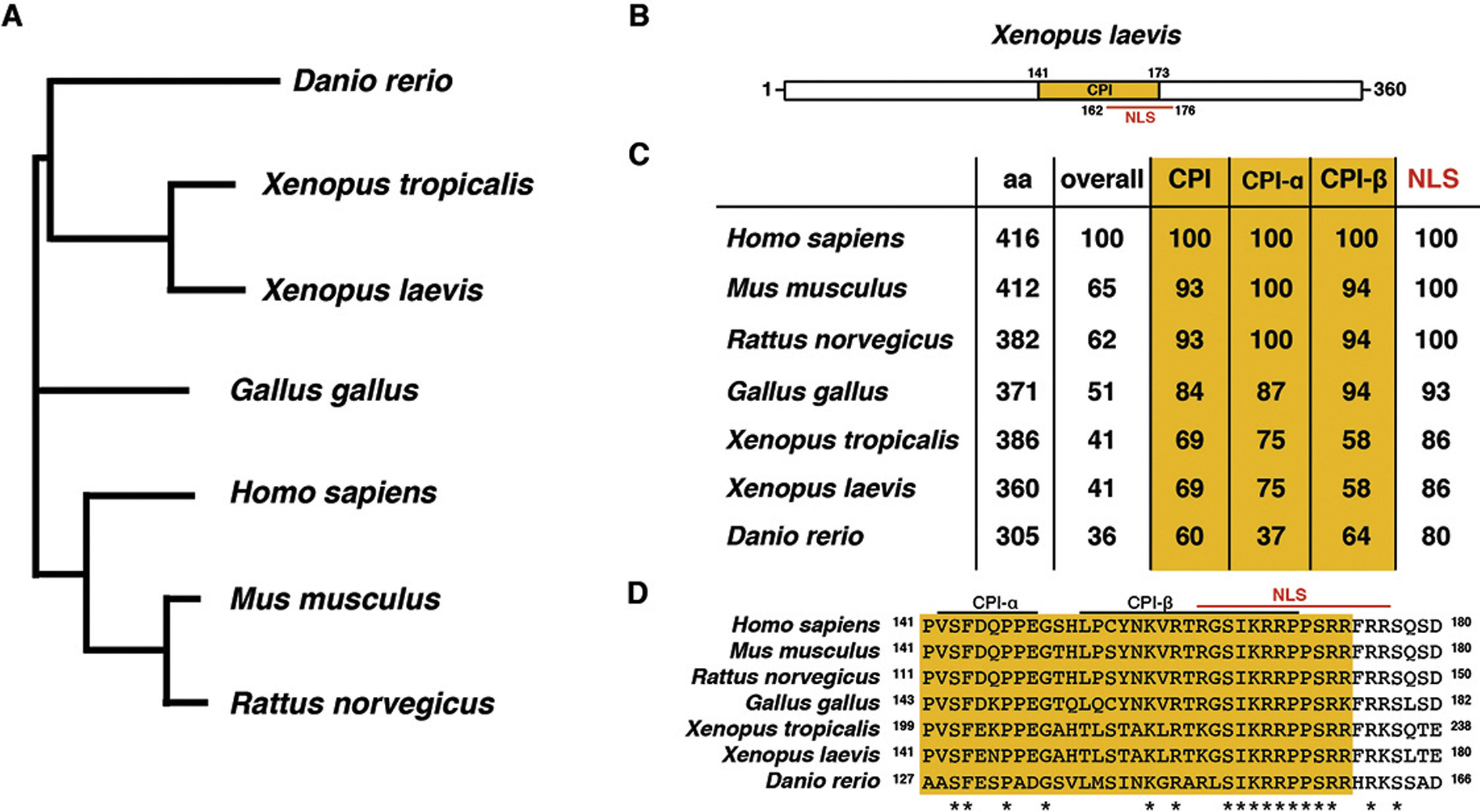Rcsd1 gene and protein analyses in various species. A. Phylogenetic tree of the human, mouse, rat, chicken, Xenopus and zebrafish Rcsd1 shows that Rcsd1 is closely related across species. Branch lengths present real lengths. B. Schematic representation of X. laevis Rcsd1 containing a capping protein interaction (CPI) and NLS motif. C. Homology analysis of the amino acid sequences of the full length (overall), full-length and subunits of the CPI domain (highlighted in yellow) and the NLS domain (red) of the Rcsd1 proteins among different species. Numbers represent similarities of the indicated species in percentage compared to Homo sapiens. Amino acid (aa) length is given in numbers. D. Sequence alignment of the CPI and NLS motif of the Rcsd1 protein among different species. Asterisks mark conserved nucleotides.