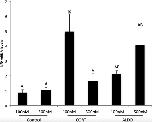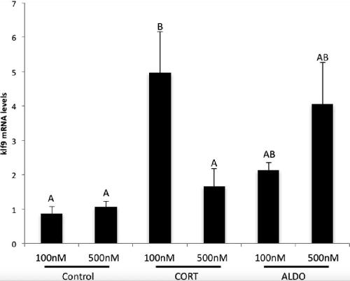 Fig. 3. Dose response of klf9 expression after CORT and ALDO treatment in tadpole tails. Both CORT and ALDO induced klf9 expression in the tail but with different dose response curves. Total RNA was extracted from tails harvested from premetmorphic tadpoles (NF54) treated with 100 and 500 nM of CORT and ALDO or vehicle controls for 24 h to measure Klf9 mRNA expression by quantitative PCR. Bars show mean mRNA levels relative to the reference gene rpL8. Error bars indicate SEM. The letters above the error bars indicate significance groups among treatments based on Tukeyâs honest significant difference test (p < 0.05, n = 5 for brain and tails and n = 3 for lungs per treatment group).