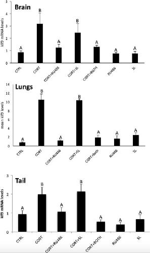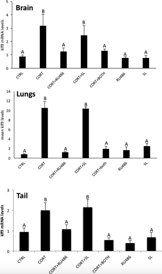 Fig. 5. Effect of receptor antagonists on CORT-induced klf9 expression in brain, lungs, and tail. CORT-induced klf9 expression was completely suppressed by type-II receptor antagonist but not by type-I receptor antagonist in each tissue. Tadpoles were raised to NF54 and treated with 100 nM CORT, 150 nM RU486, 150 nM spironolactone (SL), and EtOH control as indicated before tissue harvest at 4 h (brain and lungs) and 24 h (tails). Total RNA was isolated from brain, lungs, and tail, and klf9 mRNA levels were measured using quantitative PCR and normalized to the reference gene rpL8. Error bars indicate SEM. The letters above the error bars indicate significance groups among treatments based on Tukeyâs honest significant difference test (p < 0.05, n = 5 for brain and tails and n = 3 for lungs per treatment group).