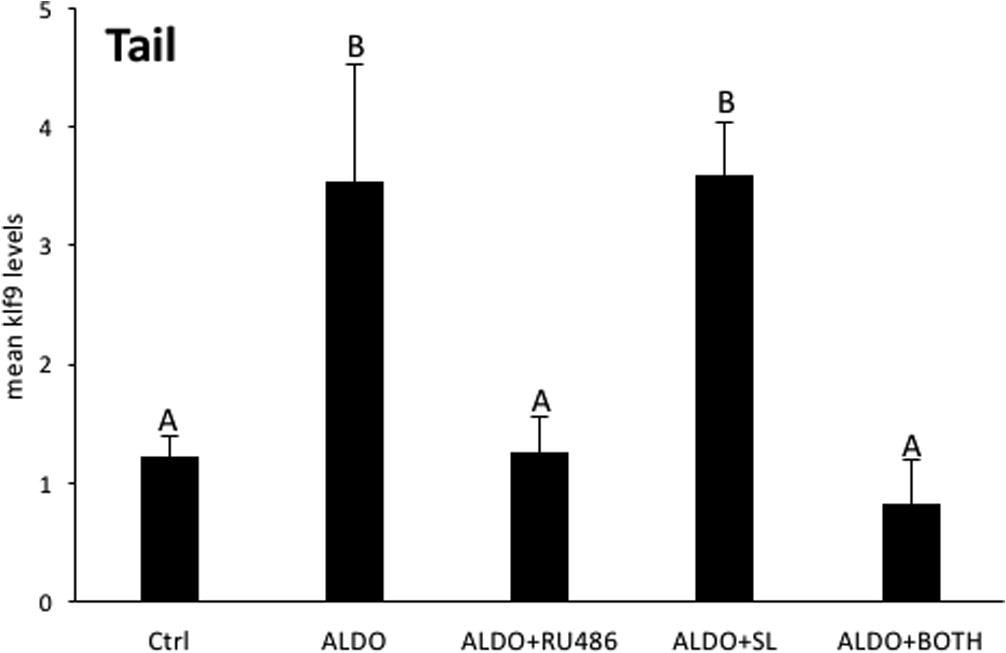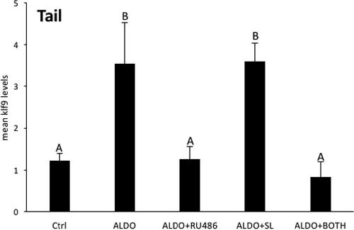 Fig. 6. Effect of receptor antagonists on ALDO-induced klf9 expression in tails. As for CORT, ALDO-induced klf9 expression was completely suppressed by type-II receptor antagonist but not by type-I receptor antagonist. Tadpoles were raised to NF54 and treated with 100 nM ALDO, 150 nM RU486, 150 nM spironolactone (SL), and EtOH control as indicated before tail harvest at 24 h. Total RNA was isolated from tails, and klf9 mRNA levels were measured using quantitative PCR and normalized to the reference gene rpL8. Error bars indicate SEM. The letters above the error bars indicate significance groups among treatments based on Tukeyâs honest significant difference test (p < 0.05, n = 5 tails per treatment group).