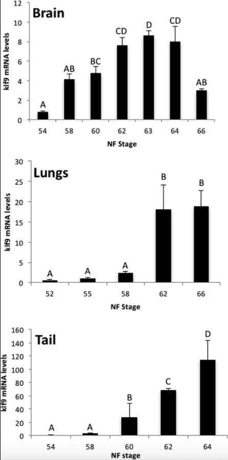 Fig. 1. Developmental profile of klf9 expression in the brain, lungs, and tail during Xenopus metamorphosis. The expression of klf9 increased significantly during metamorphosis in each tissue. Total RNA was collected from tadpole tissues at the indicated developmental stages to measure klf9 mRNA expression by quantitative PCR. Bars show the mean mRNA levels relative to the reference gene rpL8. Error bars represent SEM. The letters above the error bars indicate significance groups among stages based on Tukeyâs honest significant difference test (p < 0.05, n = 5 for brain and tails and n = 3 for lungs per stage).