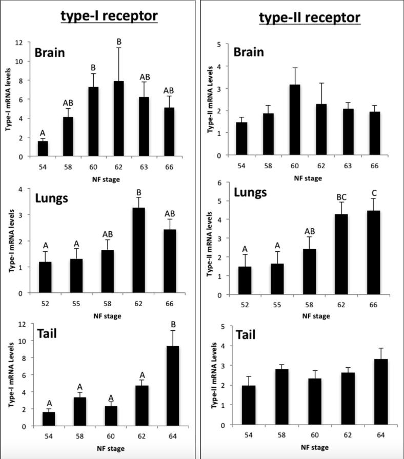 Fig. 2. Developmental profiles of type-I and type-II corticosteroid receptor expression in the brain, lungs, and tail during Xenopus metamorphosis. Expression of both receptors was detectable in each tissue at each stage and increased significantly during metamorphic climax in most cases. Total RNA was extracted from tadpole tissues at the indicated developmental stages to measure receptor mRNA expression by quantitative PCR. Bars show the mean mRNA levels relative to the reference gene rpL8. Error bars indicate SEM. The letters above the error bars indicate significance groups among stages based on Tukeyâs honest significant difference test (p < 0.05, n = 5 for brain and tail and n = 3 for lungs per stage). No letters above bars indicates a lack of significant difference among stages within the tissue.