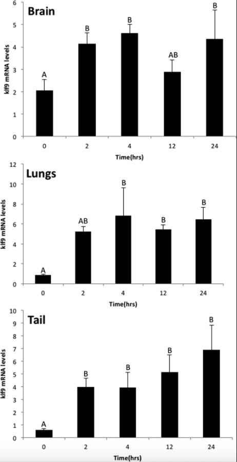Fig. 4. Time course profile of klf9 induction by CORT for brain, lungs, and tail. The expression of klf9 peaked at 4 h in brain and lungs and at 24 h in the tail. Total RNA was extracted from tissues harvested from premetmorphic tadpoles (NF54) treated with 100 CORT or vehicle controls at the indicated time points to measure Klf9 mRNA expression by quantitative PCR. Bars show mean mRNA levels relative to the reference gene rpL8. Error bars indicate SEM. The letters above the error bars indicate significance groups among treatments based on Tukeyâs honest significant difference test (p < 0.05, n = 5 tails per treatment group).
