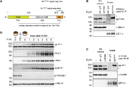 Fig. 1. Xl_Kif18A is expressed during female meiosis. (A) Domain structure of Xl_Kif18A. (B,C) Immunoblot analyses of MII extract or bead samples after immunodepletion using Ab18Apep (B) or Ab18A-C (C). IgG antibodies were used as a control (Ctrl). (D) Immunoblot analyses of immature stage-VI (S VI) arrested oocytes before and at indicated time points after progesterone treatment using indicated antibodies.