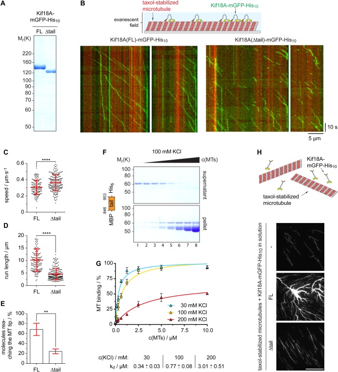 Fig. 2. Xl_Kif18A is a processive kinesin with an additional non-motor MT-binding site. (A) SDS-PAGE analyses of recombinant full length (FL) and δtail (aa 1-845) Kif18A-mGFP-His10. (B) Scheme of TIRF microscopy (top) and exemplary time (y-axis, scale bar: 10â s) versus space (x-axis; scale bar: 5â µm) plots (kymographs) of FL and δtail Kif18A-mGFP-His10. (C) Speed and (D) run length of Kif18A-mGFP-His10 and (E) percentage of all molecules analyzed reaching the microtubule tip (mean±s.d. in red, unpaired t-test: ****Pâ¤0.0001, **Pâ¤0.01). (F) MT pelleting assay with MBP-Kif18ACT-His6 using varying concentrations of MTs (0-10â µM) and KCl (30-200â mM) analyzed by SDS-PAGE (from lane 1, 0â µM MTs, to lane 8, 10â µM MTs) and (G) quantified using ImageJ (mean±s.d., n=3 independent experiments, Kd values derived from one-site-specific binding fit in GraphPad Prism). (H) MT bundling assay using fluorescently labeled, taxol-stabilized MTs and nanomolar concentrations of Kif18A-mGFP-His10.