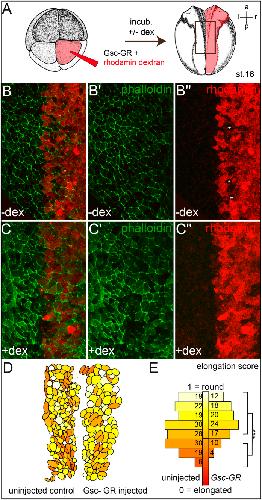 Figure 3. Gsc compromises bipolar elongation of neural plate cells.(A) Targeted injection scheme of Gsc-GR and linage tracer (rhodamine red) into the right side of the neural plate (B,C). Drawings taken from Xenbase (www.xenbase.org/anatomy/alldevo.do)97. (D,E) Analysis of cell elongation. The color gradient ranging from pale yellow (round, widthâ=âlength, 1) to dark red (elongated, 0) exemplifies the change from bipolar cells on the un-injected (right) side towards rounded cells upon activation of Gsc-GR (D). (E) Significant decrease of percentage of elongated cells (elongation score <1/2) after Gsc-GR missexpression. a, anterior; l, left; p, posterior; r, right. |