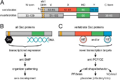 Figure 9. Vertebrate-specific Gsc functions: a model.(A) Domain structure of invertebrate and vertebrate Gsc proteins; numbers indicate ranges of amino acids. The engrailed homology (eh1/GEF) repression domain and the homeodomain (HD) are common to all Gsc proteins. Two highly conserved domains (X, Y) flanking the HD emerged at the base of the vertebrates. Note that invertebrates, besides lacking X/Y, possess variable length N- and C-terminal sequences and that the linker region between eh1/GEF and HD also varies greatly in length. (B) All Gsc proteins have the potential to act as transcriptional repressors through HD-binding to DNA and Groucho-recruitment to eh1/GEF. When assayed in Xenopus, Drosophila and vertebrate Gsc proteins act in organizer patterning and axis development through their conserved anti-BMP function. (C) Vertebrate Gsc proteins in addition affect cell shape and behavior through their anti PCP/CE function. We propose that X- and Y-domain interacting factors XIF and YIF function in recruiting novel transcriptional target genes under Gsc control. We further propose that this novel function of Gsc co-evolved with the vertebrate-specific novelties of an enlarged brain, skull and placodes, as vertebrate Gsc is expressed in the prechordal plate/floor plate of the diencephalon, neural crest mesenchyme and derivatives as well as otic vesicle/nasal cavity. |