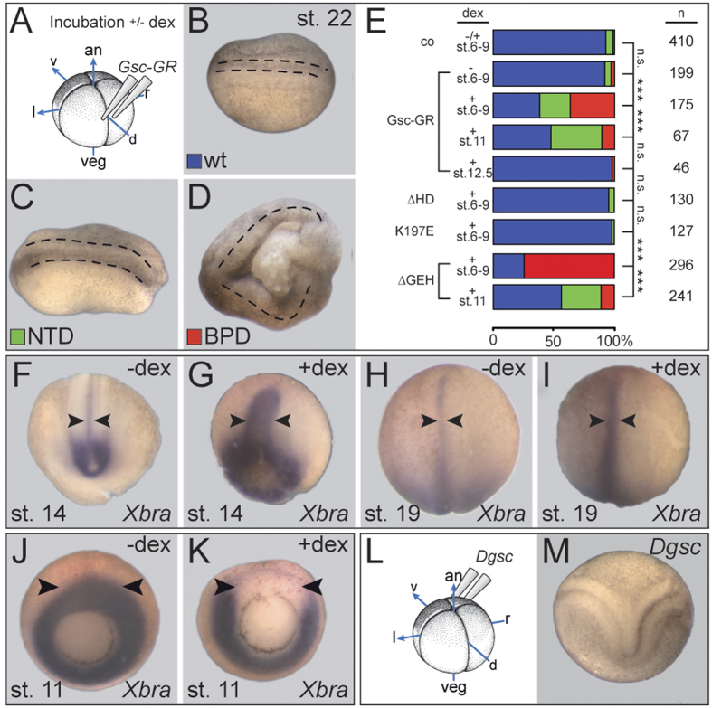 Figure 1. Gsc-mediated CE phenotypes in Xenopus.(A) Experimental design. Specimens were injected with Gsc-GR into the dorsal marginal region of the 4-cell embryo and cultured to the stages indicated, with or without addition of dex. (BâE) Gsc-GR induced NTD and BPD in whole embryos. Specimens were scored for wt appearance (blue; B), NTD (green; C) and BPD (red; D). Anterior is to the left in (BâD). (E) Compilation of results. Note that Gsc-GR caused CE phenotypes in a highly significant proportion of embryos, but only when activated before and during gastrulation. Note also that deletion of the homeodomain (âHD) or altering the DNA-binding specificity (K197E) prevented BPD/NTD-induction, while the repression domain GEH was not required for BPD/NTD. (FâI) Impaired CE of the notochord upon sustained dorsal Gsc-GR expression. Note that the notochord was wider and shorter in dex-treated (G,I) as opposed to untreated (F,H) specimens, both at stage 14 (F,G) and stage 19 (H,I). (J,K) Repression of Xbra transcription on the dorsal side upon Gsc-GR activation. (L,M) Double axis formation (M) following ventral injections of Dgsc mRNA into 4-cell Xenopus embryos (L). |