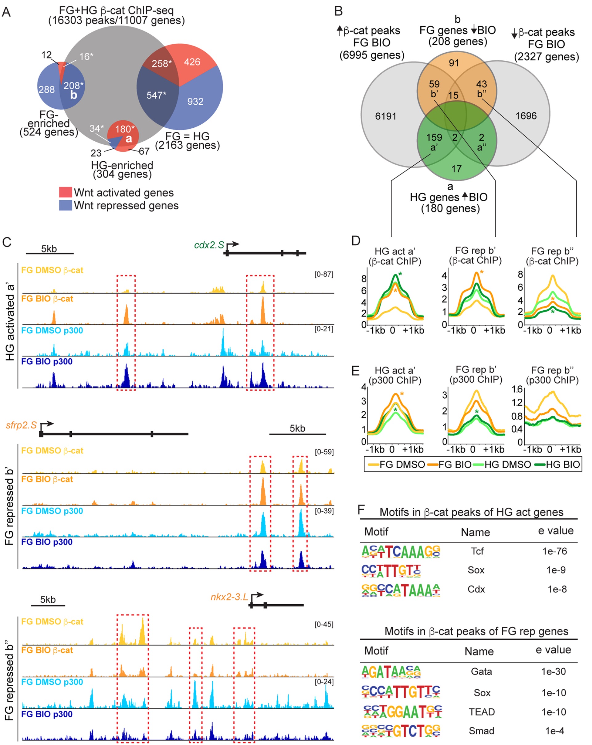Fig. 5. β-catenin chromatin binding to Wnt-regulated genes. (A) β-catenin ChIP-seq of FG and HG explants identified 16,303 peaks within 20â kb (upstream or downstream) of 11,007 genes. The Venn diagram shows the overlap between 11,007 β-catenin-bound genes and 2991 Wnt-regulated genes (from Fig. 4B) grouped as FG enriched (n=524), HG enriched (n=304) or expressed at similar levels in the FG and HG (FG=HG; n=2163) based on RNA-seq data. BMP-activated genes are in red and BMP-repressed genes in blue. *P<0.05, hypergeometric test. (B) Overlap between 180 HG Wnt-activated genes (a), 208 FG Wnt-repressed genes (b), and genes with gain (left) or loss (right) of β-catenin ChIP enrichment upon BIO treatment. (C) Genome browser view of β-catenin peaks on HG-activated gene cdx2 and FG-repressed genes sfrp2 and nkx2-3. Red boxes indicate β-catenin significant peaks. (D,E) Average tag density of β-catenin (D) and p300 (E) peaks on HG Wnt-activated genes (aâ²) and two classes of FG Wnt-repressed genes (bâ² and bâ²), comparing control with BIO treatment. *P<0.05, Wilcoxon test. (F) Motif enrichment analysis of β-catenin peaks. |