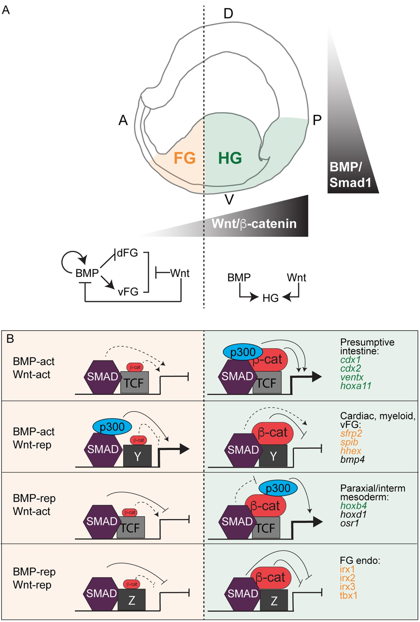 Fig. 7. BMP/Smad1 and Wnt/β-catenin converge on the same FG and HG CRMs. (A) Model of how spatially restricted Wnt and BMP activity coordinate A-P and D-V patterning of FG and HG progenitors. A signaling crosstalk in the FG is illustrated, with low Wnt promoting BMP ligand expression in the pre-cardiac mesoderm. dFG and vFG, dorsal and ventral foregut. (B) A model of how overlapping Smad1 and β-catenin binding to DNA cis-regulatory modules might regulate transcription of different classes genes in FG (yellow column on left) versus HG (green column on right) tissue. Example genes for each regulatory category are indicated on the right. Y and Z indicate transcription factors other than Tcf. Solid arrows indicate the predominant activity in the cells, whereas dashed lines indicate activity that is insufficient to regulate transcription in the cells. |