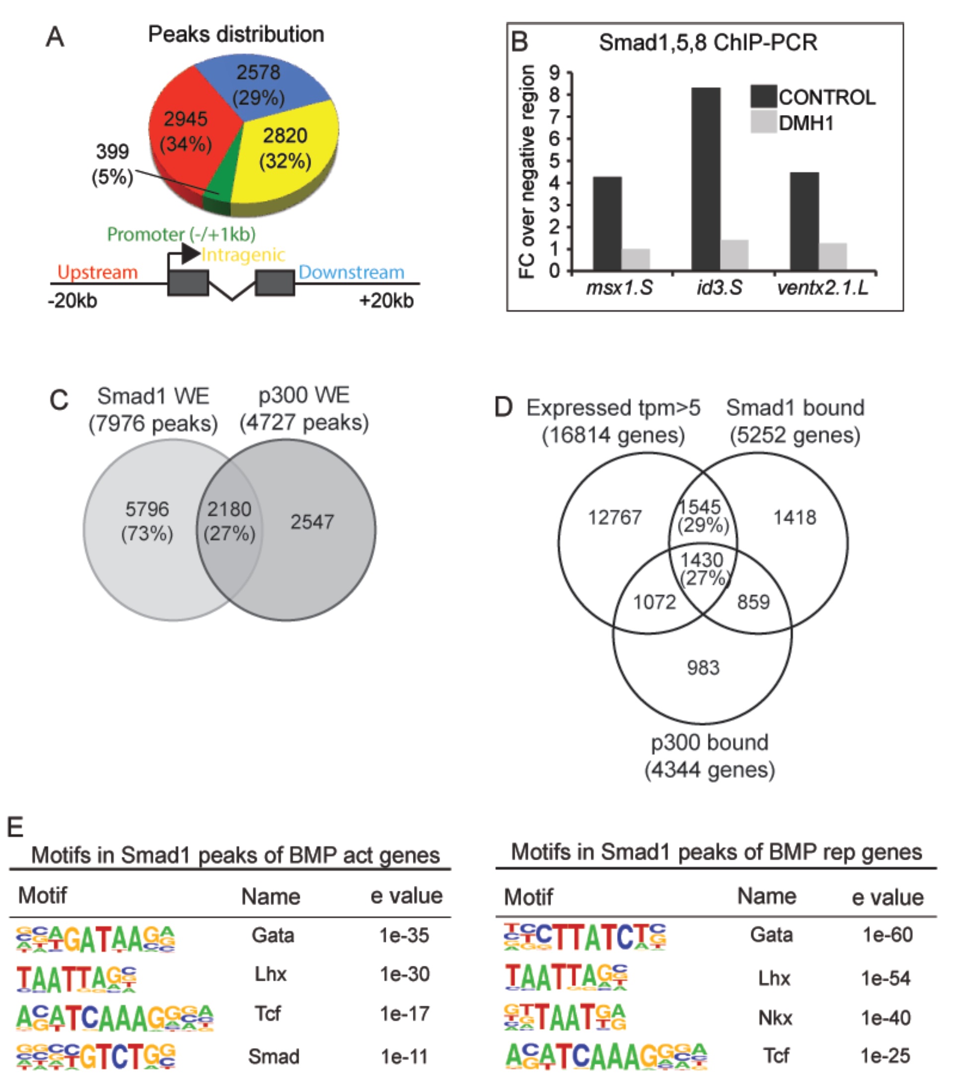 Fig. S3: Smad1 ChIP-seq of embryos stage NF20. (A) Genomic distribution of Smad1 ChIP-seq peaks in stage NF20 embryos categorized as upstream (- 20kb), downstream (+20kb), intragenic and promoter (-1kb to +1kb) regions. (B) Smad1 ChIP-PCR of known BMP-target genes showing reduced Smad1-binding to CRMs of msx1, id3 and ventx2.1 promoters in DMH1 treated embryos compare to DMSO controls. (C) Peak overlap between Smad1 and p300 ChIP-seq of stage NF20 whole embryos. (D) Venn showing the overlap between Smad1-bound genes, p300-bound genes and genes expressed in NF20 embryo at levels higher than 5 transcripts per million (TPM>5) based on RNA-seq. (E) Motif enrichment analysis of Smad1 ChIP-seq peaks associated with activated (act) or repressed (rep) genes. |