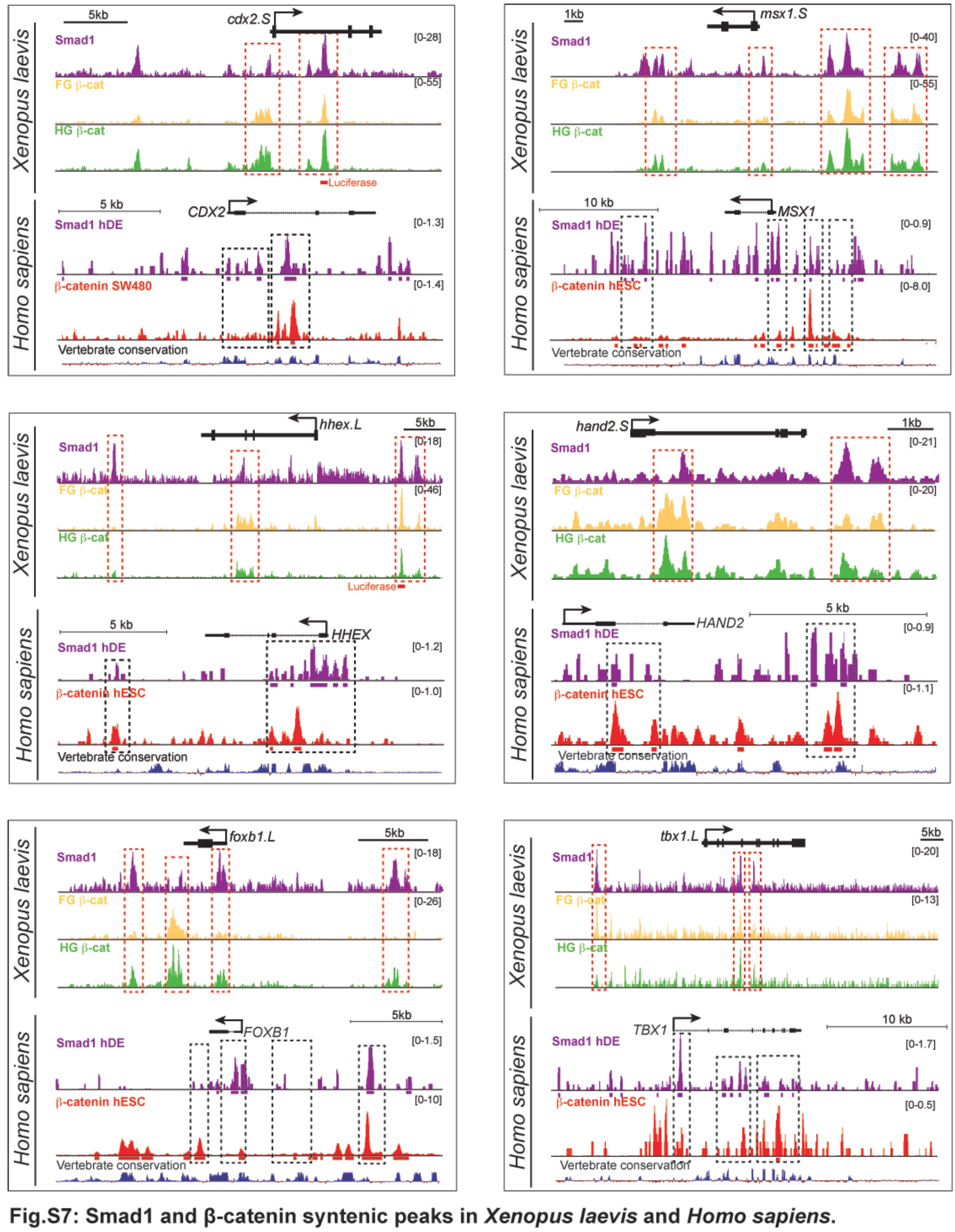 Fig.S7: Smad1 and β-catenin syntenic peaks in Xenopus laevis and Homo sapiens. Browser view of β-catenin and Smad1 peaks in Xenopus and human genes (from the following public data: GSM1505734 and GSM1579346). Red boxes indicate overlapping Smad1 and β- catenin peaks. Black boxes indicate syntenic peaks. |